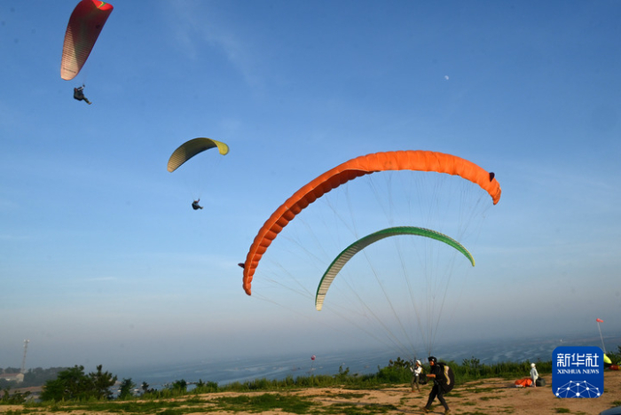 7月5日,游客在山东省荣成市爱伦湾海滨体验滑翔伞运动。新华社发(杨志礼摄)