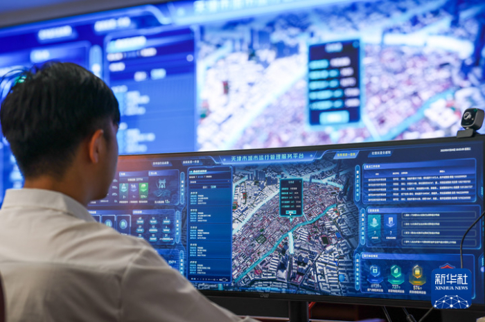7月9日,在天津市城市管理委员会,工作人员通过天津市城市运行管理服务平台进行实时监测。新华社记者孙凡越摄