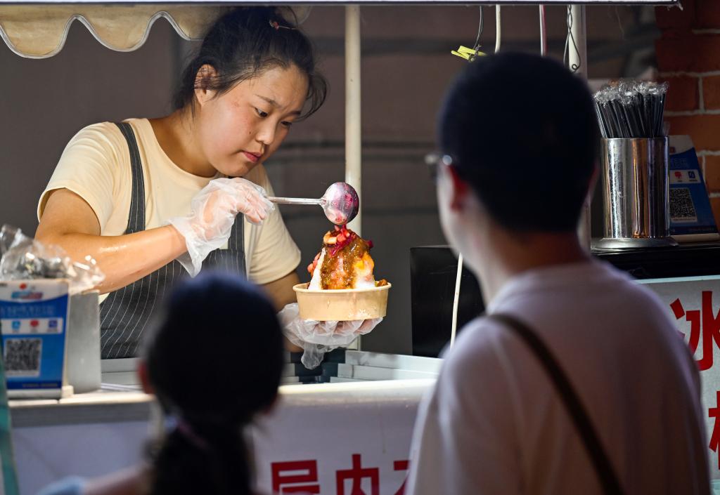 在天津市南开区,一家街边商户正在制作刨冰。新华社记者 赵子硕 摄