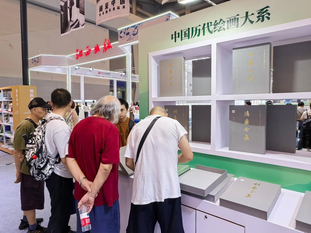 读者在“阅见中国——全国图书精品展”展区阅读《中国历代绘画大系》系列图书。(王丽 摄)