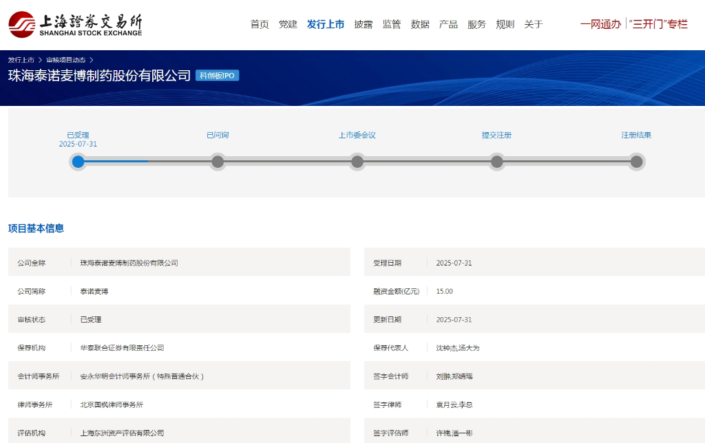 7月31日,上交所受理了珠海泰诺麦博制药股份有限公司的IPO申请。泰诺麦博成为重启科创板第五套上市标准后首家成功受理的企业。