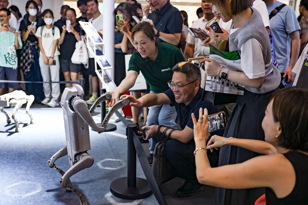 参观者在2025世界人工智能大会展览现场和一款机器狗互动(2025年7月29日摄)。新华社记者 陈浩明 摄