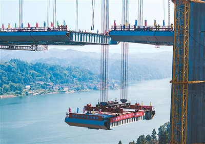 8月3日,由湖南路桥建设集团承建的张官高速控制性工程洞庭溪沅水特大桥主桥顺利合龙,为2026年全线通车奠定坚实基础。张官高速公路北起张家界市永定区,南至怀化市沅陵县官庄镇,是国家高速公路网呼和浩特—北海高速公路的重要组成部分。图为大桥施工现场,一块钢混结合梁在被缓缓提升。新华社记者 陈思汗摄