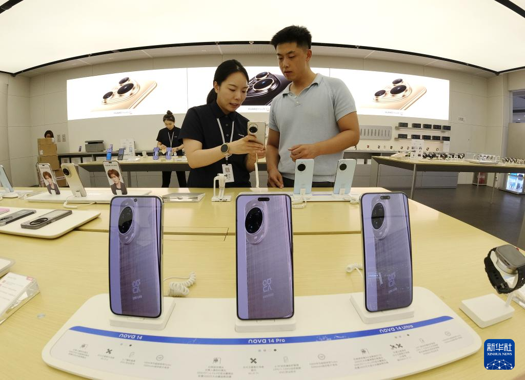 8月9日,消费者在山东省滨州市一家手机专卖店选购手机。新华社发(初宝瑞摄)