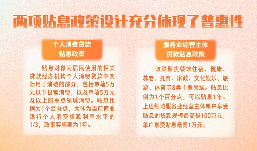 日前,财政部等部门对外发布了《个人消费贷款财政贴息政策实施方案》和《服务业经营主体贷款贴息政策实施方案》。