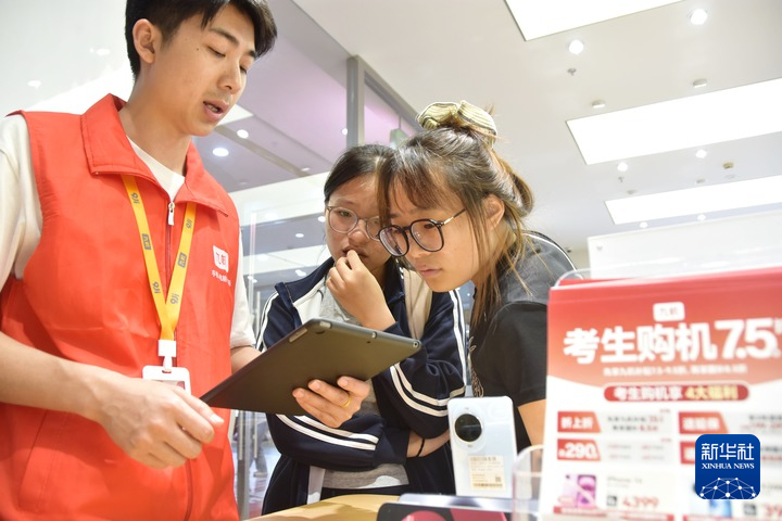 2025年6月23日,云南省蒙自市一商店工作人员为两名今年的高考考生讲解手机以旧换新政策。新华社发(薛莹莹摄)