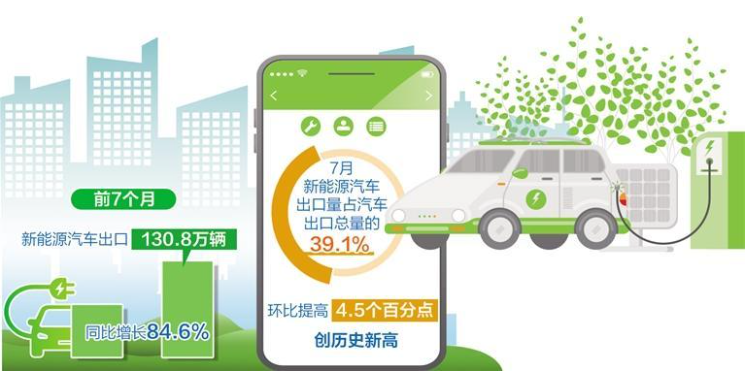 值得一提的是,新能源汽车出口数量增长明显。前7个月,新能源汽车出口130.8万辆,同比增长84.6%,成为外贸增长的亮点。
