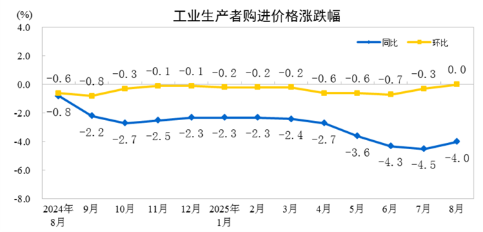 2025年8月份,全国工业生产者出厂价格同比下降2.9%,降幅比上月收窄0.7个百分点,环比由下降0.2%转为持平。工业生产者购进价格同比下降4.0%,环比持平。1—8月平均,工业生产者出厂价格比上年同期下降2.9%,工业生产者购进价格下降3.3%。