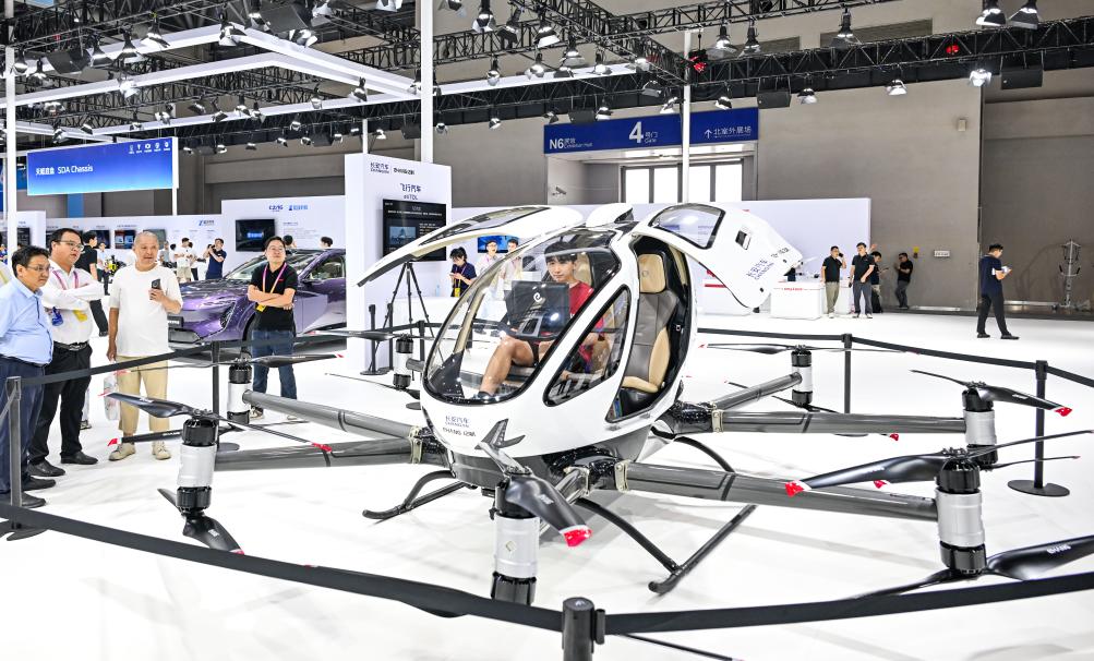 2025年9月5日,在重庆举行的2025世界智能产业博览会上,观众在长安汽车展区参观、体验“飞行汽车”。新华社记者王全超摄