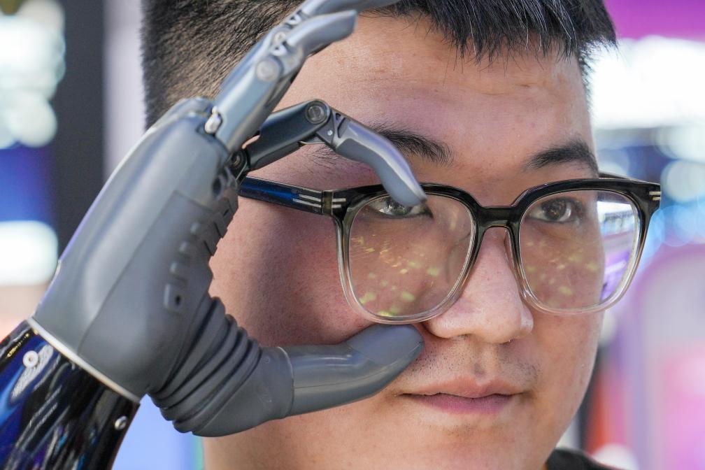 2025年7月17日,在北京举行的第三届中国国际供应链促进博览会上,浙江强脑科技有限公司一名右手残疾的工作人员在佩戴了BrainCo智能仿生手后摘取眼镜。新华社记者鞠焕宗摄