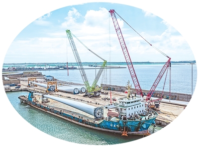 在山东省荣成市石岛管理区的海上风电产业基地,超大型风电叶片正在吊装和运输,准备运往海上作业区进行安装。李信君摄(人民视觉)