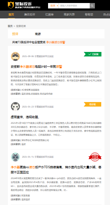 在黑猫投诉平台,对净水器滤芯的投诉不在少数,多集中于“使用频率不高却频繁提示更换”“售后未检测直接建议换滤芯”等问题。