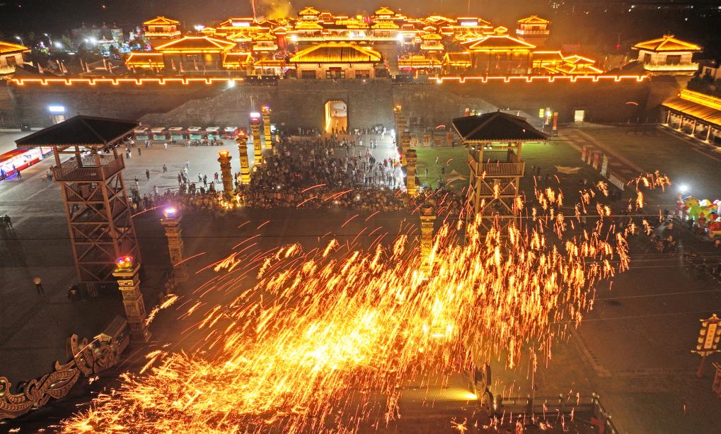 10月3日晚,游客在山东省临沂市郯城县郯国古城景区观看打铁花。新华社发(张春雷摄)