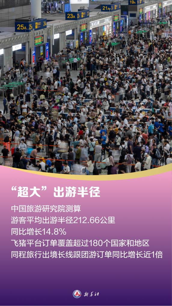 8天假期再加上灵活的“拼假”,让人们旅行半径扩大。中国旅游研究院测算,假日期间,游客平均出游半径212.66公里,游客目的地平均游憩半径23.04公里,同比分别增长14.8%和24.5%。携程集团数据显示,假期国内长途游订单占比同比提升3个百分点;飞猪平台上,我国游客足迹覆盖超过180个国家和地区,明显高于去年假期;同程旅行平台上,出境长线跟团游订单同比增长近1倍。