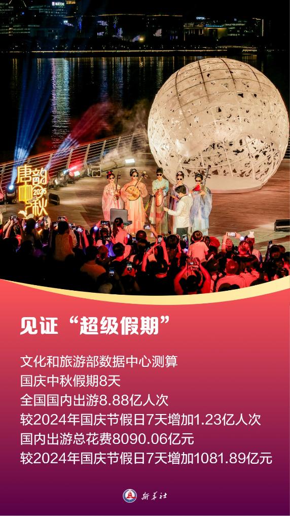 文化和旅游部发布数据显示,经文化和旅游部数据中心测算,国庆中秋假期8天,全国国内出游8.88亿人次,较2024年国庆节假日7天增加1.23亿人次;国内出游总花费8090.06亿元,较2024年国庆节假日7天增加1081.89亿元。
