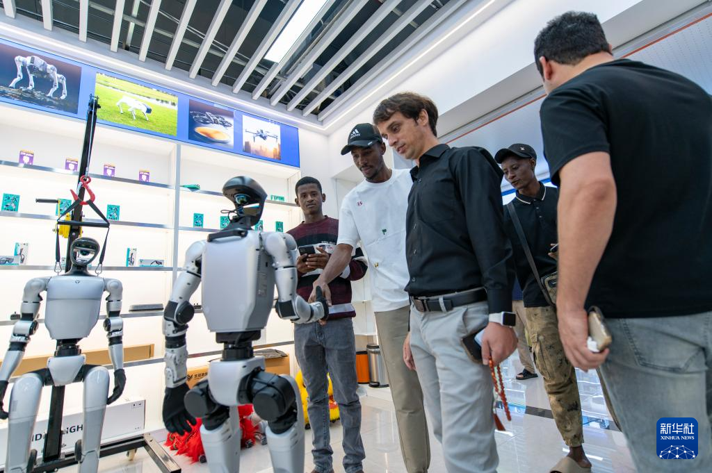 10月14日,外籍客商在义乌全球数贸中心与机器人互动。新华社发(胡肖飞摄)