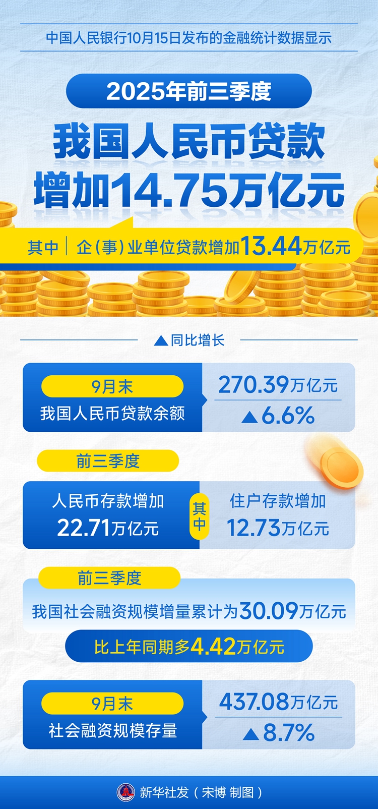 新华社北京10月15日电(记者吴雨、任军)中国人民银行15日发布的金融统计数据显示,今年前三季度我国人民币贷款增加14.75万亿元,其中企(事)业单位贷款增加13.44万亿元。