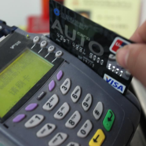 一名工作人员使用POS机为客户刷卡。新华社发(梁志强 摄)