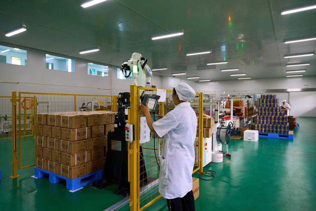 贵州山王果健康实业有限公司5G智慧工厂工人正在给机械臂下指令。(受访者供图)