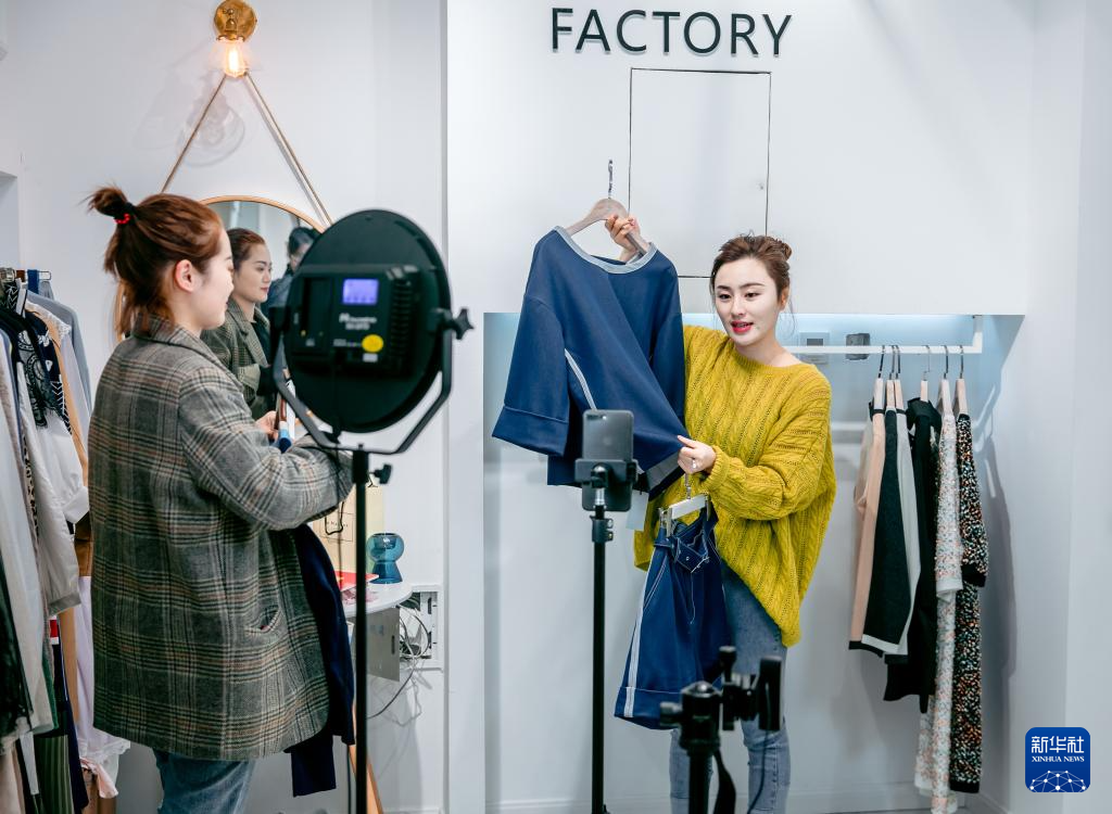 在常熟服装城,商家在进行网络直播销售(资料照片)。 新华社发