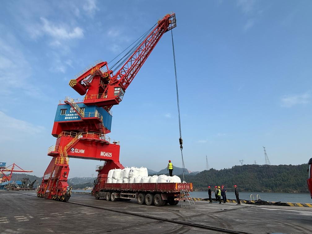 图为赣州港五云综合枢纽码头货物装卸现场。新华社记者朱雨诺 摄