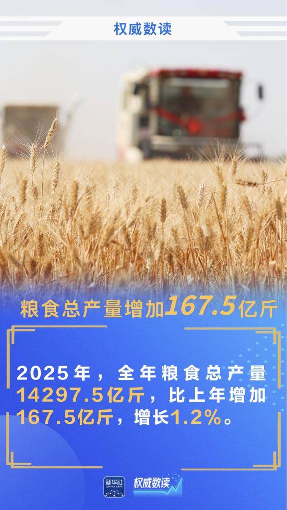 国家统计局12日发布数据,2025年,全国粮食产量14297.5亿斤,比上年增加167.5亿斤,增长1.2%,稳定在1.4万亿斤以上,全国粮食实现增产丰收。