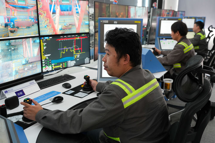 工作人员在宁波舟山港梅山港区的远控操作室内装卸集装箱(2025年12月2日摄)。新华社记者 翁忻旸 摄