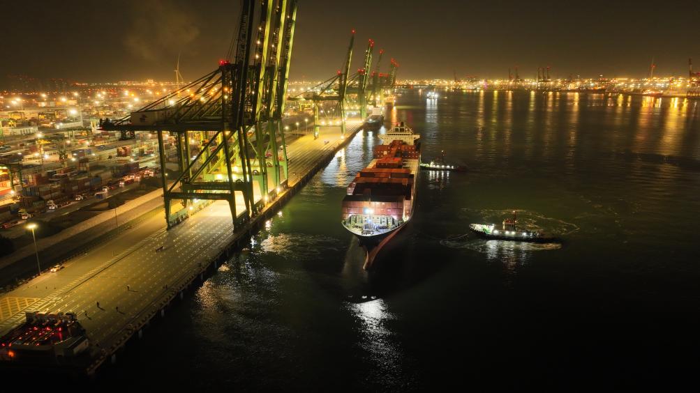 1日晚,在天津港太平洋国际集装箱码头东6泊位,我国北方今冬首船智利进口车厘子抵津。新华社发