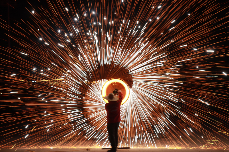 2026年2月18日,在河南省安阳市内黄县文化体育中心,民间艺人表演打铁花。新华社发(刘肖坤摄)
