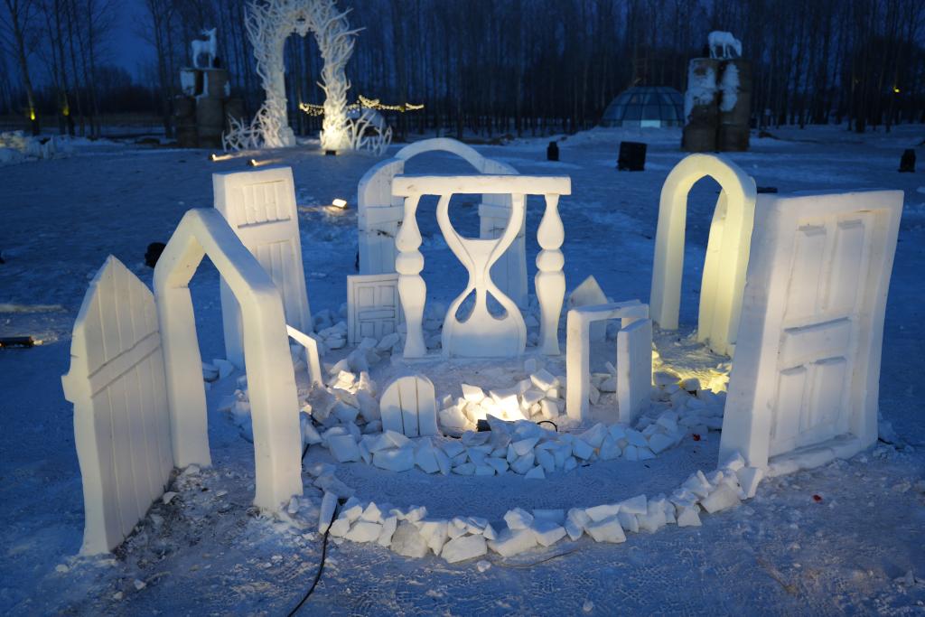 “时间的沙漏被无数扇抉择的门环绕,每扇门的背后都是未知的风景和难断的犹豫。不知该推开哪扇门,这便是人人都曾经历的迷茫。”13岁的于凯蒂和李昕冉、杨一涵共同创作了雪雕作品《迷茫》,在她们眼中,迷茫从不是停滞,而是人们对未来的思考。