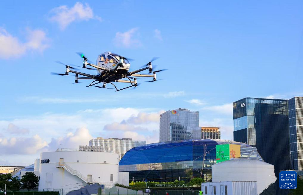 在2025国际低空经济博览会期间,亿航智能的无人驾驶载人eVTOL(电动垂直起降飞行器)在上海飞行(2025年7月23日摄)。新华社发