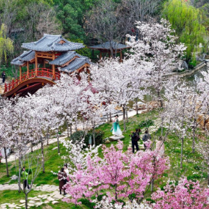 3月22日,游人在湖北省襄阳市盛世唐城景区樱花园内赏花游玩(无人机照片)。新华社发(杨东摄)