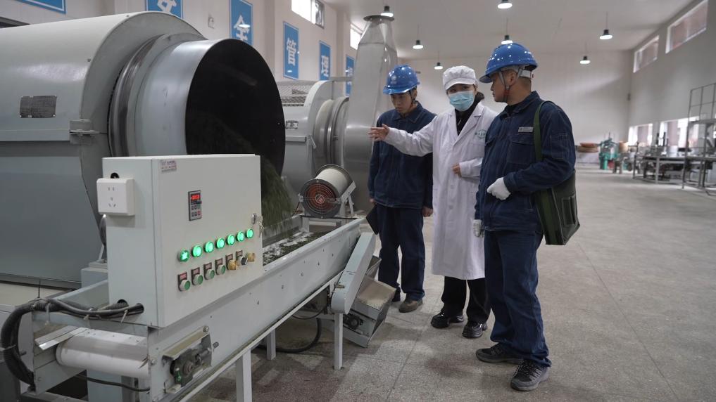 在茶叶加工车间,自动化生产线有序运转,工人们根据鲜叶等级分类加工。相关部门工作人员深入茶叶加工企业,提供指导支持。
