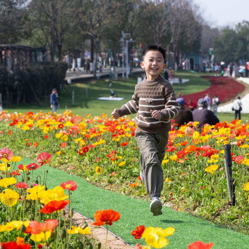 小朋友在武汉花博汇赏花玩耍。新华社记者 肖艺九 摄