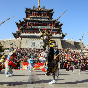 2月20日,民间艺人在陕西省咸阳市渭城区清渭楼广场表演英歌舞。新华社发(李军朝 摄)