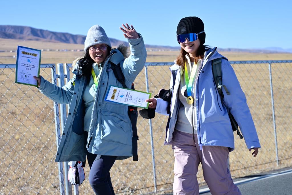 青海湖两名徒步爱好者抵达徒步活动终点。新华社记者 齐芷玥 摄