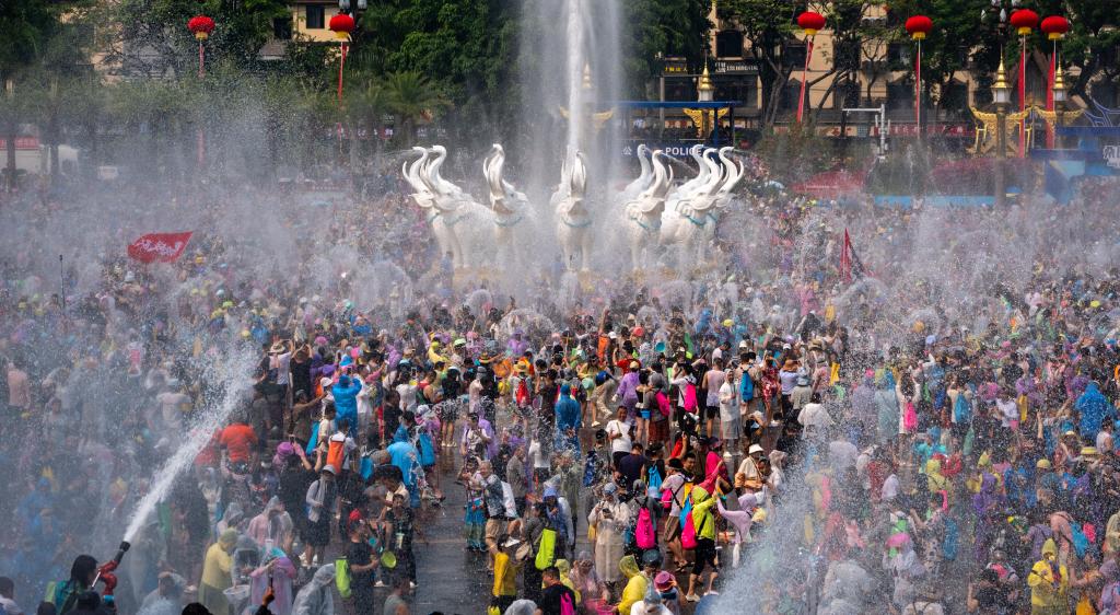 4月15日,人们在泼水广场参加泼水狂欢活动。新华社记者 江文耀 摄