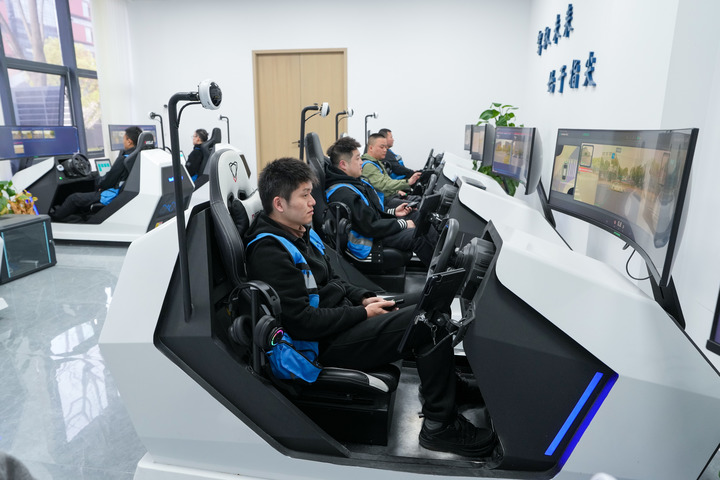 无锡市智驾运营服务中心远控中心,安全员在远程监控无人驾驶小巴车的运行情况。新华社记者 李博 摄