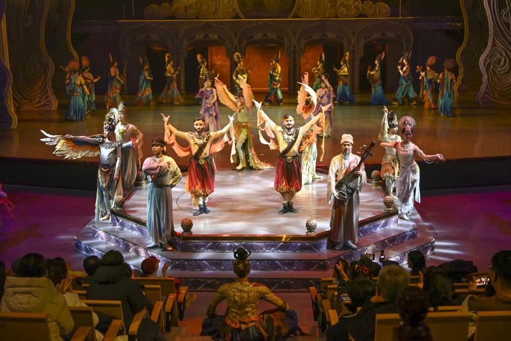 游客在甘肃敦煌观看大型洞窟沉浸式体验剧《乐动敦煌》。新华社发(张晓亮摄)