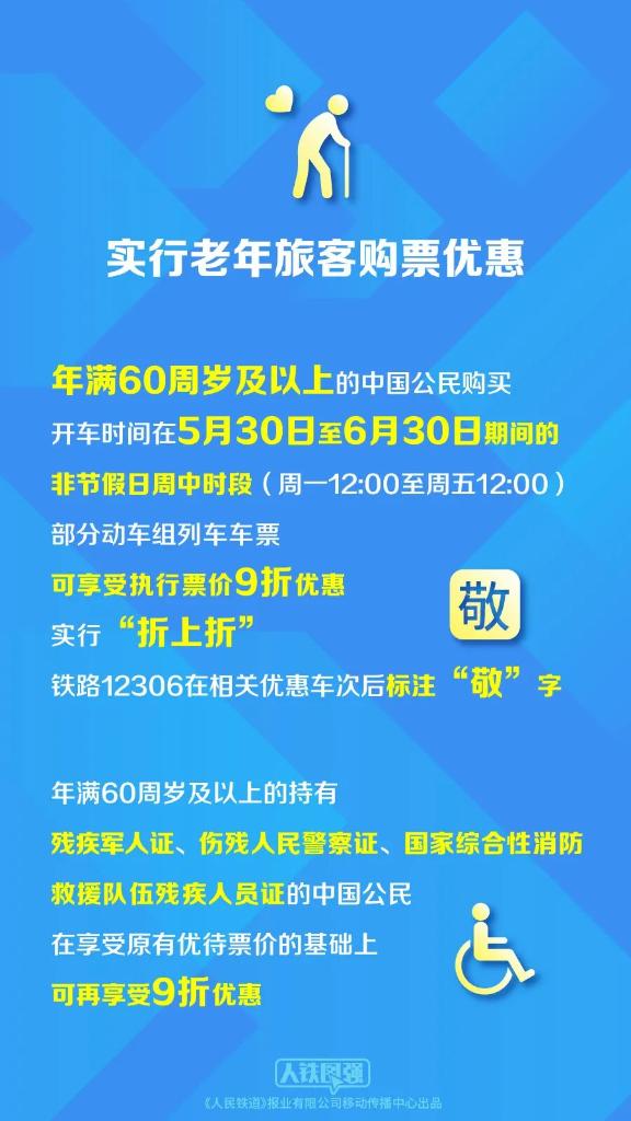 年满60周岁及以上的中国公民购买开车时间在5月30日至6月30日期间的非节假日周中时段(周一12:00至周五12:00)部分动车组列车车票,可享受执行票价9折优惠,实行“折上折”,铁路12306在相关优惠车次后标注“敬”字;年满60周岁及以上的持有残疾军人证、伤残人民警察证、国家综合性消防救援队伍残疾人员证的中国公民,在享受原有优待票价的基础上,可再享受9折优惠。老年旅客可同时享受普通常旅客会员的三倍积分优惠,积分可用于兑换火车票或办理座位升级业务。