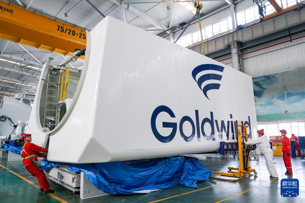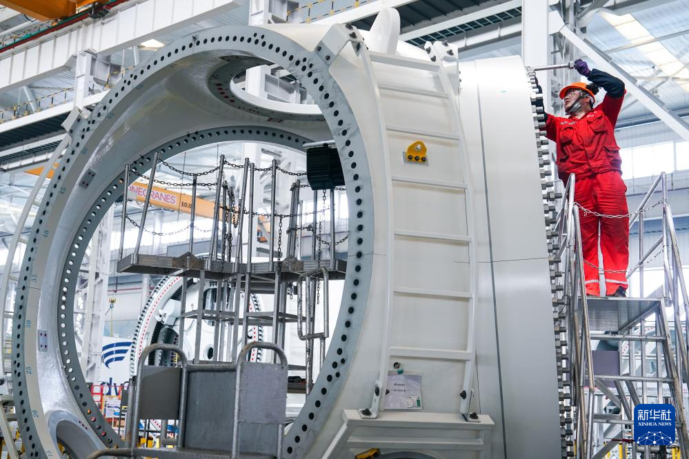 工人在位于江苏盐城的金风科技生产车间组装风力发电机组(3月26日摄)。新华社记者 李博 摄
