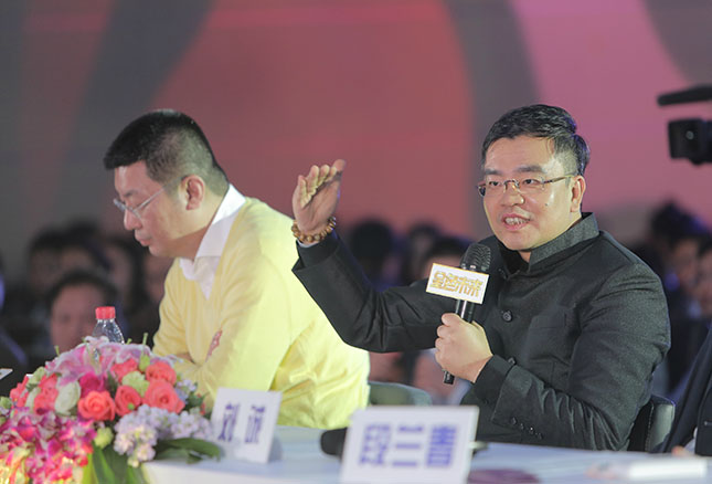 图为贝因美创始人谢宏作为创业导师在首届贝因美杯中国金色未来创业大赛决赛现场做点评发言