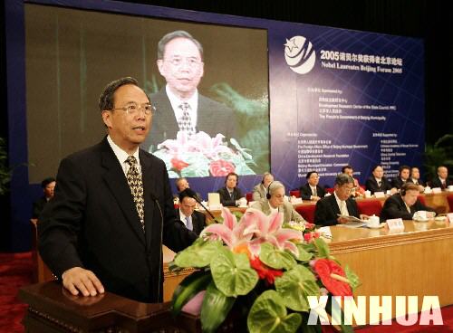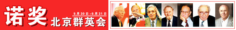 | “2005诺贝尔经济学奖获得者北京论坛”2005年5月30日在北京举行。此次论坛由国务院发展研究中心、北京市人民政府主办。罗伯特蒙代尔、约翰纳什、詹姆斯莫里斯等诺贝尔经济学奖获得者及世界知名经济学家汇聚一堂,以“人类的和谐与发展”为主题进行一场世界顶级水平的经济学和经济政策论坛。 | 蒙代尔 1999年诺奖得主 福格尔 1993年诺奖得主 纳 什 1994年诺奖得主 莫里斯 1996年诺奖得主 普雷斯科特 04诺奖得主 格兰杰 2003年诺奖得主 史密斯 2002年诺奖得主 |