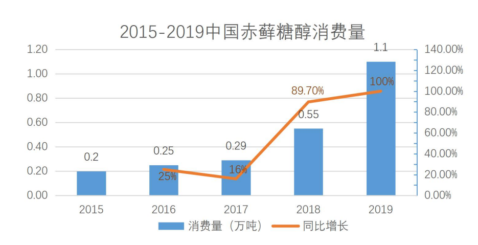根据沙利文研究的数据显示,近年来我国赤藓糖醇的消费量呈现出明显的增长态势。2018年赤藓糖醇消费量增长率达到了89.7%,2019年的增长率达到100%,随着“健康中国2030”计划的稳步推进,以及全球范围内控糖、减糖意识的逐步普及和渗透,赤藓糖醇在未来的消费量仍有较大的提升空间。