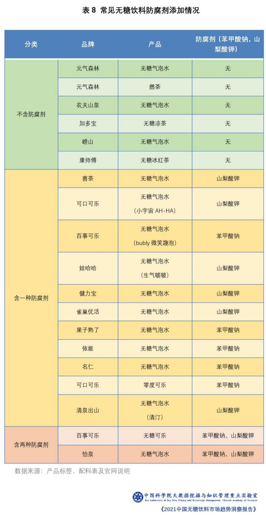中科院报告指出,不添加防腐剂成为企业和公众关注的话题。由于满足消费者对“健康”的关注,防腐剂将成为未来各大饮料品牌的主要竞争点。目前饮品类常用的防腐剂包括苯甲酸钠和山梨酸钾。相比之下,山梨酸钾安全性超过苯甲酸钠。