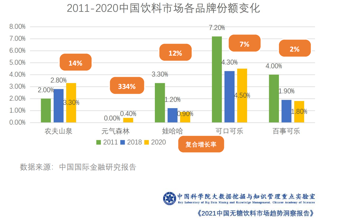 中科院报告援引相关数据显示,最近十年国内饮料市场各大品牌表现迥异。其中,元气森林复合增长率最高,达334%,但2020年其在整体饮料市场份额仅为0.4%。农夫山泉复合增长率为14%,占整体市场3.3%。可口可乐、百事可乐等两大国际巨头复合增长率分别为7%和2%,分别占整体市场4.5%和1.8%。