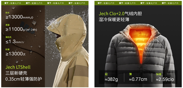 据了解,蕉下气绒冲锋衣通过蕉下自有AntiTec防护科技(寒冷防护,暴风防护,疲劳防护,暴雨防护,暴汗防护五大科技),叠加自研Jech LTShell新硬壳和Jech Clo+气绒2.0内胆,实现防水指数≥13000mmH2O,透湿指数≥11000g/(㎡•24h),防风指数≤1.3mm/s,耐磨≥13000次,防水、透湿等指数超过国标两倍。