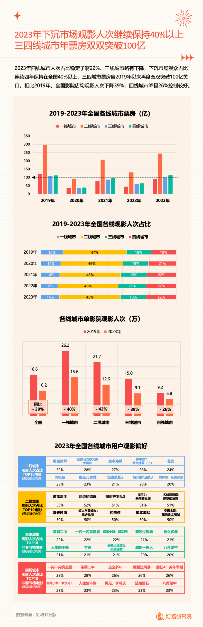用户画像显示,2023年女性观众占比攀升至58%,女性及成熟女性观影需求逐渐主导市场。下沉市场观影人次继续保持40%以上,三四线城市年票房双双突破100亿。