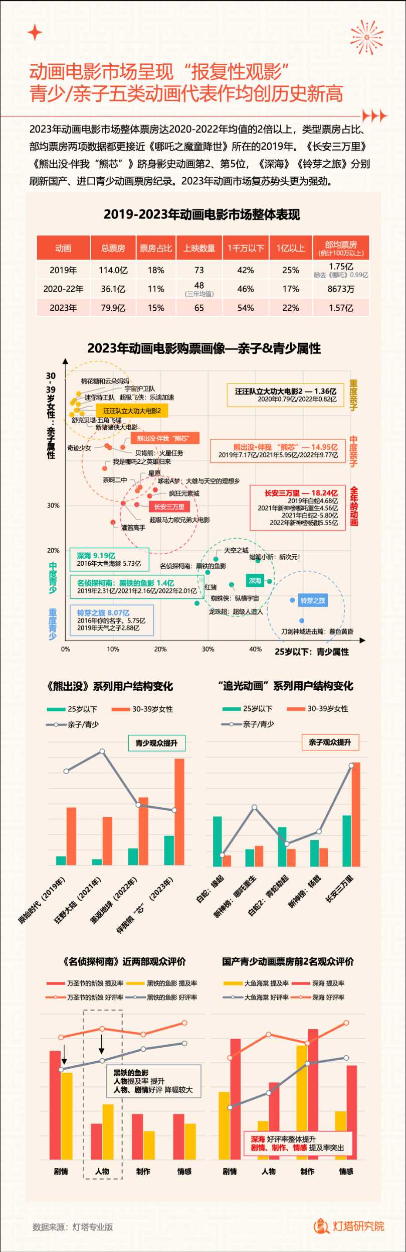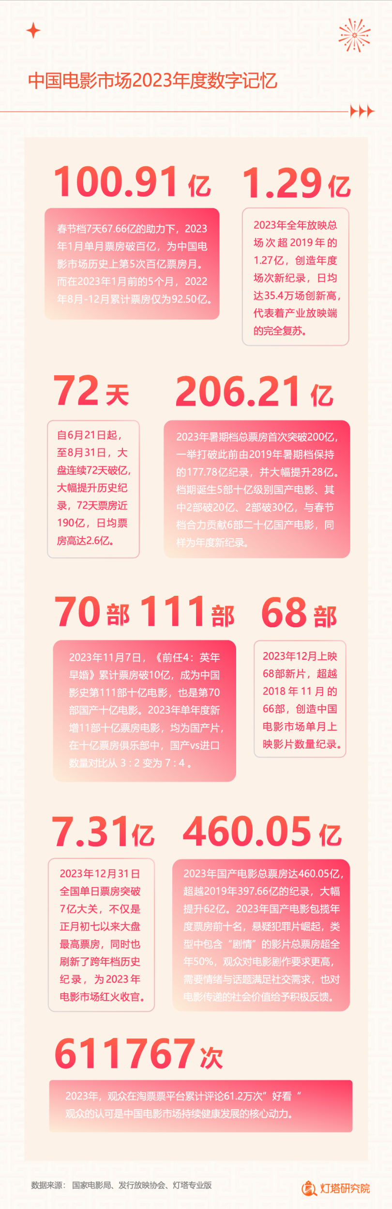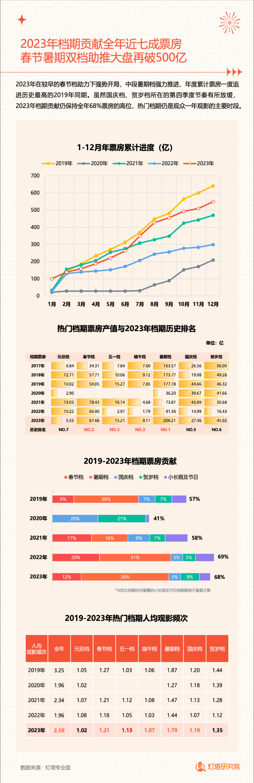 新华网北京1月2日电(记者闫雨昕)2024年1月1日,灯塔研究院联合新华网发布《2023中国电影市场年度盘点报告》(以下简称“报告”),从市场核心数据、观影消费习惯、热门档期与周末档、宣发新风向、用户画像等方面进行分析。