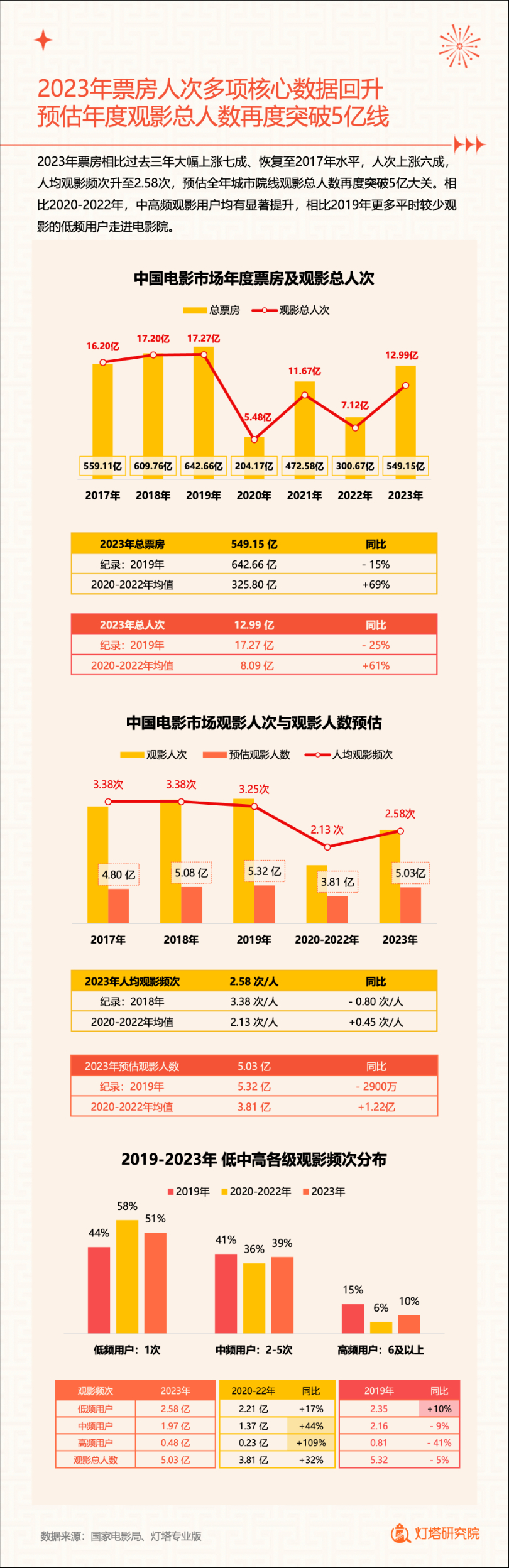 报告显示,2023年票房相比过去三年大幅上涨七成、恢复至2017年水平,人次上涨六成,人均观影频次升至2.58次,预估全年城市院线观影总人数再度突破5亿大关。相比2020-2022年,中高频观影用户均有显著提升,相比2019年更多平时较少观影的低频用户走进电影院。